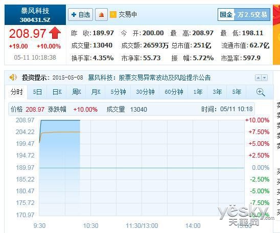 5个月之前,暴风科技在95.83元的高价位停牌,经历了股市震荡,又恰逢上市一周年大量股票解禁,大部分分析师都认为其复牌将补跌,然而昨日复牌的暴风科技逆市涨停,今日又在早盘一度接近跌停的情况下,逆市暴涨4.83%。